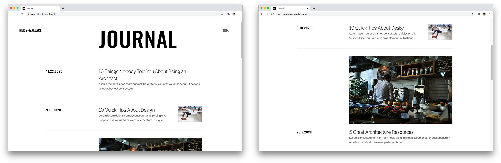 There are three different visual styles for the list of journal entries. If you don't add an image to the entry, it will automatically choose the default style – no image. If you add an image, it will automatically choose the second style – small image. And finally, if you choose to "feature" the entry, it will automatically choose the third option which is a larger style image.